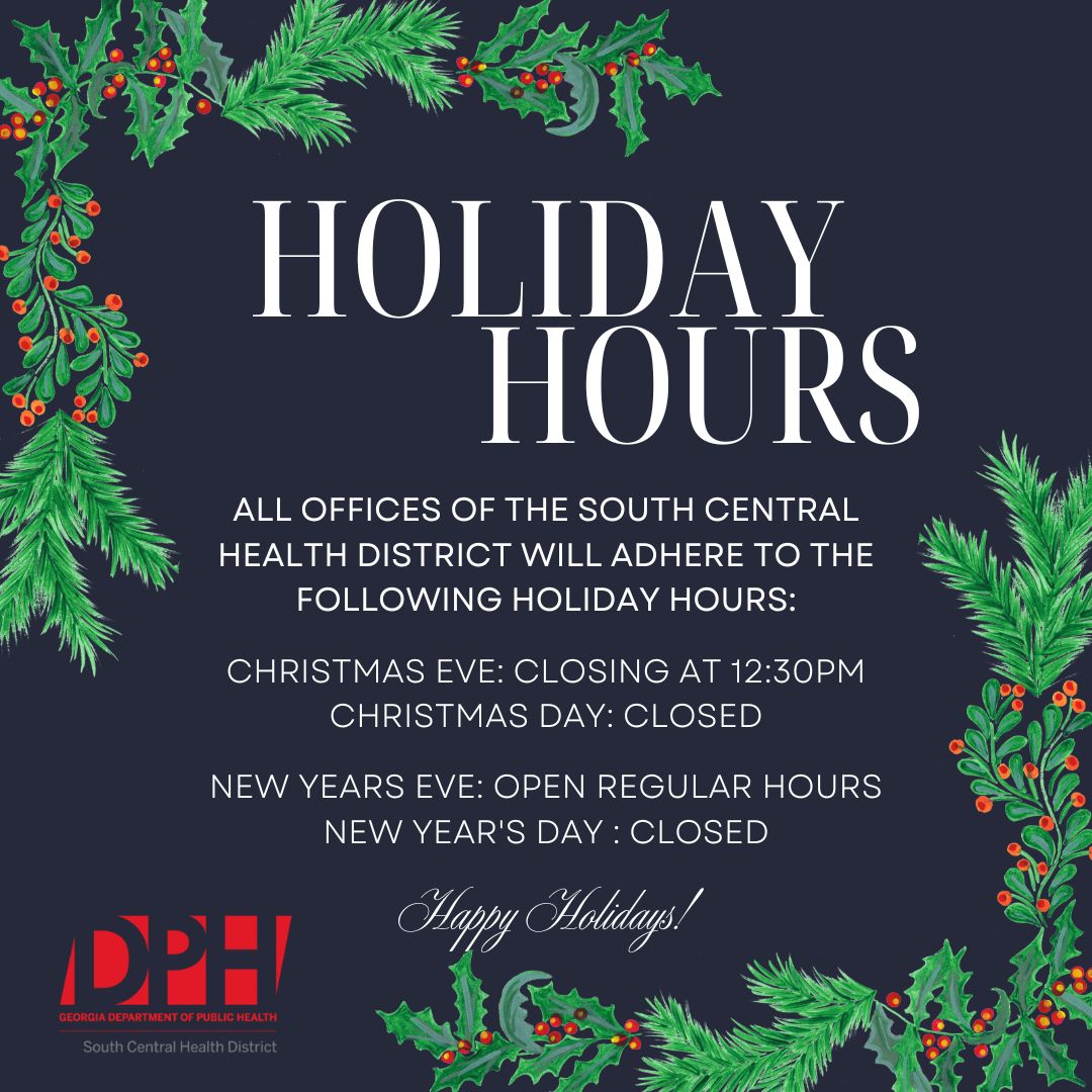 South Central Health District Holiday Hours Posted at 15:50 PM South Central Health District will adhere to the following holiday hours: